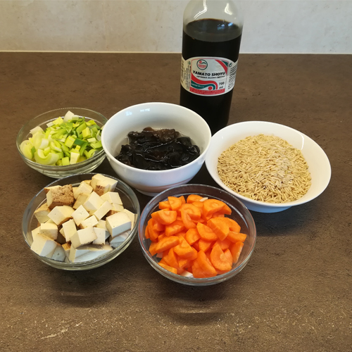 Mezitím si propláchneme rýži a dáme ji vařit se špetkou soli a oleje. Možno přidat 1tobolku kardamonu. Před koncem varu přidáme tofu na prohřátí. Odstavíme z plotny a dochutíme yamato shoyu. Podáváme s rýží.