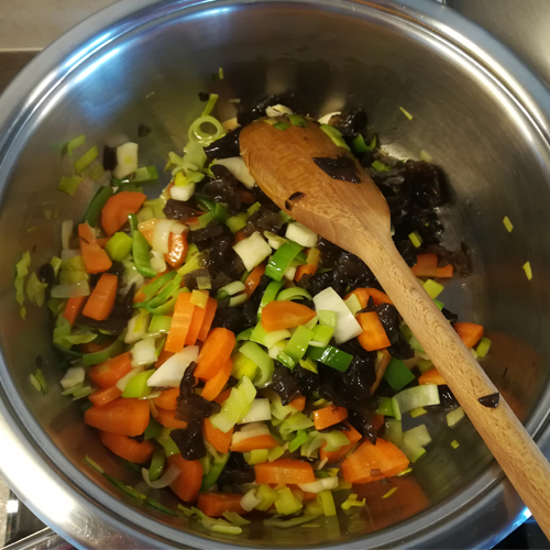 Do kastrolu dáme olej a přidáme pórek. Krátce orestujeme. Následně přidáme mrkev a lehce osolíme (spíš méně, ve finále "dosolíme" sójovou omáčkou) a opepříme. Restujeme chvíli společně. Mezitím si slejeme jidášovo ucho a pokrájíme na malé kousky. Přidáme k zelenině, mírně podlijeme a vaříme min. 15 minut, aby byla houba dostatečně povařená.