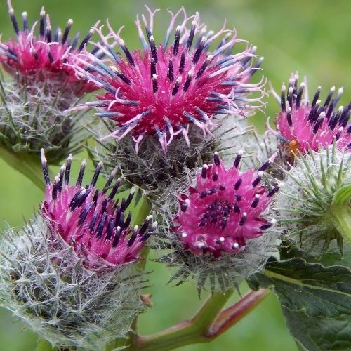 - Lopuch větší je dvouletá bylina vyššího vzrůstu, která může dosahovat výšky až 2,7 m. Má obrovské listy, které mohou mít v průměru i 50 cm. Tato rostlina kvete fialovými květy, které se sjednocují do shluků. Květ je tvořen mnoha listeny, které vypadají jako samostatné háčky. Díky tomu je bylina rozšiřována na dlouhé vzdáálenosti v srsti zvěře, kde se zachytí. Vyskytuje se jak na evropském, tak asijském kontinentu. Najdete ji nejčastěji při procházkách lesem, poblíž vody a na rumištích. Pro účely fytoterapie se využívá kořen a semena. Zralá podlouhlá semínka - Niu Bang Zi jsou hnědavé barvy a vyznačují se ostrou a hořkou chutí.