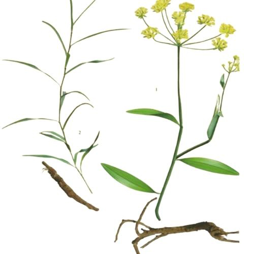 - Vytrvalá bylina s lysou, vzpřímenou, listnatou lodyhou, dorůstající výšky 30–80 cm. Kořen je dřevnatý a rozvětvený, na povrchu hnědý, na řezu žlutobílý.