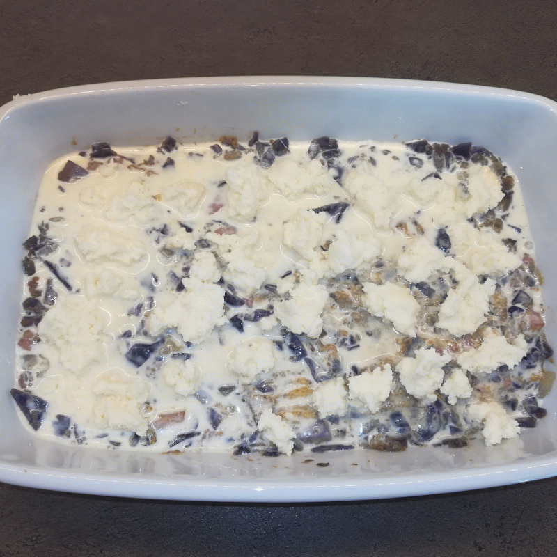 Měkkou zeleninu scedíme, necháme okapat a vložíme do mísy. Přidáme slaninu, špetku (mletého) kmínu, opepříme, osolíme a přidáme trochu majoránky. Vše poctivě promícháme, ochutnáme, v případě potřeby ještě dosolíme. Hotovou směs vložíme do zapékací mísy a přelijeme smetanou s vejci. Navrch můžeme a nemusíme dát brynzu. Dáme zapéct do vyhřáté trouby na 200 C. Pečeme ca 40 minut. Podáváme klidně jen tak nebo třeba s brambory, kuskusem, obilovinami. Naše děti tento pokrm milují s bramborovou kaší.
