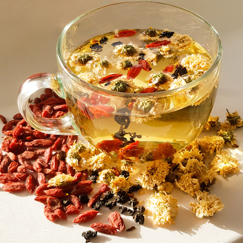 První z nich - kustovnice - po dlouhé zimě posílí Yin Ledvin a Jater (vnímáme jako energetické orgány) a druhá - chryzantéma - urovná a pročistí Játra